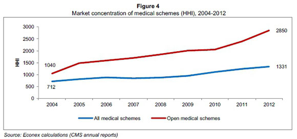 From the evidence presented in Figure 4, it is clear that there has been a consistent increase in market concentration of the open medical schemes market. The HHI increased almost threefold from 1 040 in 2004 to 2 850 in 2012. The steady increase in market concentration was largely due to the significant growth in Discovery Health's membership (and one or two other large open schemes), as well as many amalgamations among the schemes.