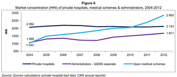 In 2004 there was a large difference between the HHI for private hospitals (2 062), that of the administrators (1 069) and open medical schemes (1 040) markets. Over time, this discrepancy decreased due to increases in concentration of the open medical scheme and administrator markets while concentration in the private hospital market remained fairly constant. By 2010 there was very little difference between concentration in the private hospital and open medical scheme markets, at HHI levels of 2 088 and 2 049 respectively. The level of concentration continued to increase for administrators and also increased sharply for open medical schemes, reaching 1 677 for administrators (GEMS separate) and 2 850 for open medical schemes in 2012.