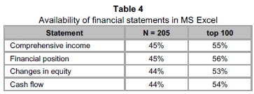 Companies also provided financial statements in downloadable format (Table 4) that enables users to further manipulate the information without re-entering information. Nel (2004:8) found that of the top 50 companies, only 26 per cent provided MS Excel statements. Therefore, the current finding of 44-45 per cent is a huge improvement, given the larger sample. Once again, the top 100 companies scored about ten per cent better in this regard. However, given that most, if not all companies would have their financial statements in spreadsheet format in any case, it is not clear why more companies do not provide users access to information in this user-friendly format.