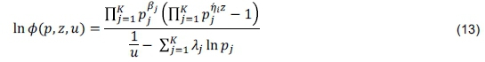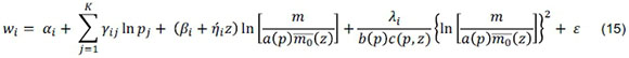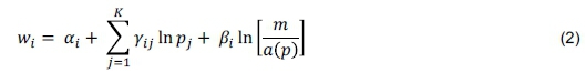 Similar to the AIDS model, where the consumer demand theory conditions in notation (4), (5), (6), (9) and (14) hold (which are imposed during estimation), notation (15) provides a system of demand functions which add up to total expenditure (Σ wi; = 1), are homogeneous of degree zero in prices and total expenditure, and adhere to the Slutsky symmetry theory.