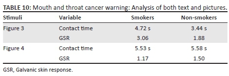 Table 2 reveals that Figure 2 initiated a higher difference in GRS responses than did Figure 1 (p = 0.06). However, the same result was not found for Figures 3 and 4. In the case of the packaging highlighting mouth and throat cancer, the text stimulus initiated a higher GSR response than did the pictorial warning. Therefore, Figure 4 did not result in a significantly higher GSR score than did the text-only warning.