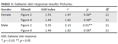 Table 3 explores the relationship between gender and the GSR responses to the pictures. Table 3 shows that males were aroused to a significant extent (p < 0.01) by Figure 2 (the gangrene-affected foot). The GSR responses of females to Figure 2 were not significant, although the difference approaches statistical significances (p = 0.06). However, the responses of males to Figure 2 seemed to be much stronger than those of females.