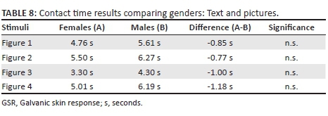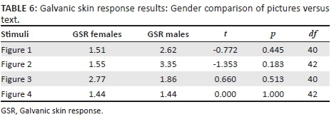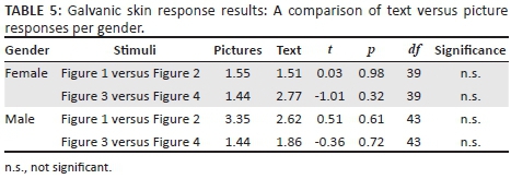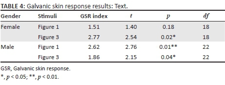 Table 4 reveals that, when exposed to the text messages, both males and females returned significant responses from the baseline, except when females looked at Figure 1 ('Smoking causes peripheral vascular disease'). It thus appears as if text-based messages were also able to solicit subconscious responses among the participants.