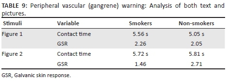 The GSR results reported in Table 1 show that both the text and the picture warnings of gangrene and mouth cancer generated GSRs that were significantly different from the baseline. Figure 2 (gangrene-affected foot) seemed to produce the highest level of arousal, followed by text message 2 that smoking causes mouth and throat cancer.