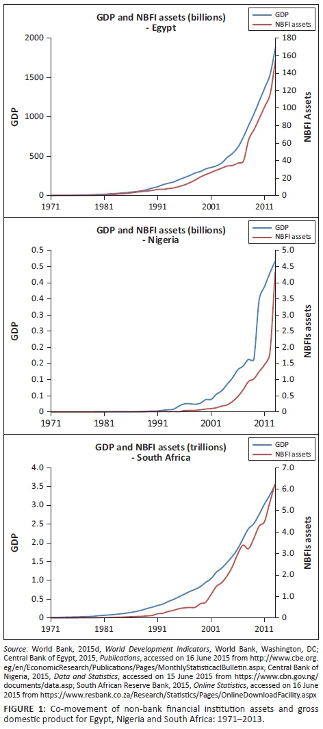 In order for the post-2015 world development agenda - termed the sustainable development goals - to succeed, there is a pronounced need to ensure that available resources are used more effectively and that additional financing be accessed from the private sector (International Monetary Fund 2015a). However, given the lingering fragility of financial markets in the wake of the recent global financial crisis, the availability of long-term financing required to support productive investment has been constrained (World Bank 2015a). Specifically, traditional bank lending has slowed down substantially as banks recover from the financial crisis and adjust to tighter regulatory controls - mostly emanating from the stricter Basel III capital and liquidity requirements. To this end, the development of non-bank financing has become imperative (World Bank 2013a). This article accordingly explores the role of non-bank financial institutions (NBFIs) as a source of long-term funding. In doing so, the article investigates the linkage between NBFI development and economic growth (the finance-growth nexus) using time-series data from Africa's three largest economies (Egypt, Nigeria and South Africa) over the period 1971 to 2013.