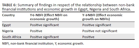 RESULTS: The results showed that the long-run relationship between NBFI development and economic growth is relatively stronger in Egypt and South Africa, than in Nigeria. Evidence in respect of Nigeria shows that such a relationship is weak. The nature of the relationship between NBFI development and economic growth in Egypt is positive and significant, and predominantly bidirectional. This suggests that a virtuous relationship between NBFIs and economic growth exists in Egypt. In South Africa, the relationship is positive and significant and predominantly runs from NBFI development to economic growth, implying a supply-leading phenomenon. In Nigeria, the results are weak and mixed.