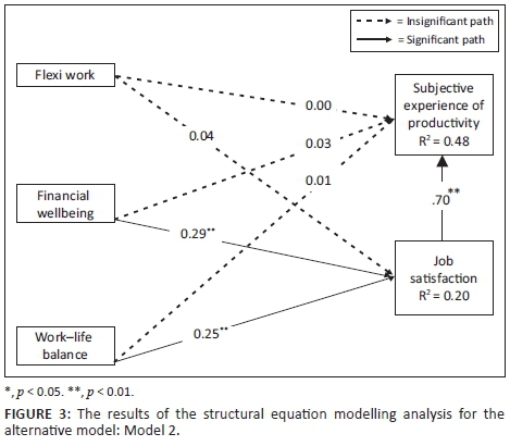(Steyn 1999), to indicate whether obtained results were practically important. The parameters 0.01 (small effect), 0.09 (medium effect) and 0.35 (large effect) were set for practical significance of f2 (Steyn 1999). Structural equation modelling (SEM) was performed using AMOS 21 (Arburkle 2014) program to investigate the mediating role of productivity in the relationship between flexible work, financial well-being, work-life balance and job satisfaction (Fransman 2015).
