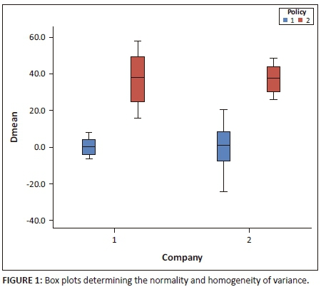 Figure 1 shows that the mode of change between company A (labelled as 'company 1') and company B (as 'company 2') from pre- (i.e. policy 1) to post- (in policy 2) gainsharing period is homogeneous. Box plots indicate a similar spread of gainsharing results from both companies. Statistical tests suggest that the conditions for homogeneity of variance between the pre- and post-gainsharing periods from the two companies have been met. This is confirmed by Levene's test of equality shown in Table 8.