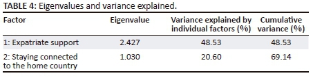 Table 3 shows the factor matrix with sorted rotated factor loadings, where Factor 1 was named 'expatriate support', as it summarises the enterprise's actions to assist with the adjustment process upon arrival as well as during the assignment. Factor 2 was named 'staying connected to the home country', as it involves all communication initiatives and home visits to prevent the 'out of sight, out of mind' syndrome. The two factors account for 69.14% of the total variance in the data space (see Table 4).
