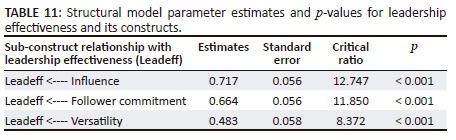 The hypothesised relationship between the leadership effectiveness construct and its sub-constructs (influence, follower commitment and versatility) was confirmed by use of SEM. The results shown in Table 11 demonstrate the parameters and the p-values of the data.