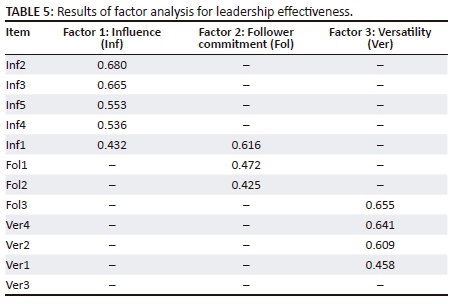 Upon subjecting the leadership effectiveness construct to a CFA assessment, three sub-constructs (influence, follower commitment and versatility) loaded accordingly while two (group organisation and cross-cultural competency) did not load as expected and were consequently eliminated from further analysis. The leadership effectiveness construct explained 48.6% of the variance in the data. The results of the three sub-constructs that successfully loaded as expected are presented in Table 5.