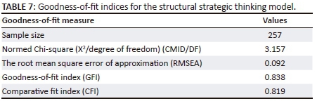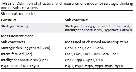 Firstly, a CFA was conducted to determine unique factors in the data and assess the discriminant validity of the scales measuring the independent and dependent variables. The validity of the strategic thinking sub-variables (referred to as sub-constructs), namely strategic thinking (general), thinking in time, intent-focused, intelligent opportunism, system perspective and hypothesis-driven, were extracted and confirmed. In this study, only factor scores of 0.3 or above were accepted for further analysis (Hair et al. 2006:128).