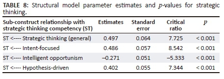 Similarly, the hypothesised relationship between strategic thinking competency and its sub-constructs was analysed. The results demonstrating the parameter estimates and the p-values are summarised in Table 8.