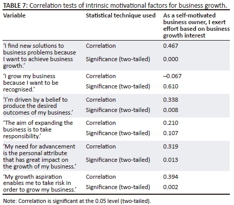 The relationship in Table 7 for determining the variables of self-motivated business owners who exert an effort based on business growth interest was analysed: