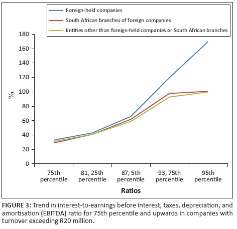 The mean ratio for foreign-held companies starts to increase relative to the other two groups from the 75th percentile, as is evident from the results in Table 3 and is also illustrated in Figure 1. The difference between the mean ratios for this group and the other two categories of entities increases more significantly for each percentile greater than the 75th percentile presented. It is submitted that this trend identified for foreign-held entities may be an indication of more aggressive tax behaviour in the form of high interest deductions. It is further submitted that this is the area that BEPS actions should be aimed at.