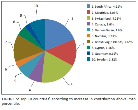 Lastly, the countries from which investment is made into South Africa in the form of the establishment of foreign-held entities were considered. Figure 5 provides an indication of the change in contribution to total investment by country (based on the number of entities) from all percentiles to the 75th percentile. This analysis would provide insight into companies from certain countries with a greater presence in the 75th percentile and upwards.