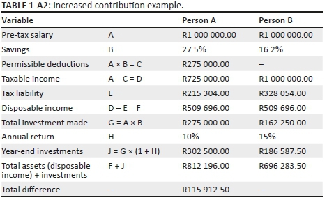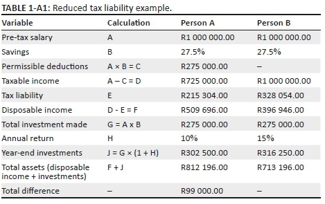 Persons A and B are hypothetical identical individuals. Both have a pre-tax income of R1 000 000 per annum. A opts to contribute 27.5% of his pre-tax salary to a Regulation 28 compliant pension fund. Person B opts to invest 27.5% of his pre-tax salary in local equities. The effect of this is that person A will receive a deduction against their total income, whereas person B will not. The result is that person B will have less disposable income at year-end.