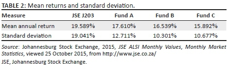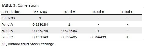 The top three Regulation 28 compliant funds ('funds') over the period were compared to the JSE: ALSI. The comparison considered the mean annual return, the standard deviation and the correlation between movements in the monthly fund values and the JSE.