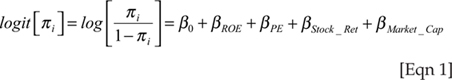 where πi is the probability that the dependent variable takes on a value of 1, xi represents the variables included in the regression, β represents the coefficients of the variables, β0 is an intercept parameter, ROE represents the return on equity, PE represents the price-earnings ratio, Stock_Ret represents the stock returns and Market_Cap represents the market capitalisation of each company.