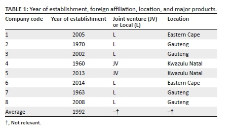 A mixed research method that uses both the quantitative and qualitative approach in addressing the research problem was employed, while the analysis is descriptive in nature. A combination of a standard survey questionnaire and informal interviews was used to collect the production and management data. A simple random sample of eight automotive auto-parts suppliers were selected from each of the three key automotive regions in South Africa, which are Gauteng Province (including Johannesburg and Pretoria), KwaZulu Natal (including Durban), and the Eastern Cape (including Port Elizabeth and East London). Four of the eight companies are located in Gauteng, two are located in the Eastern Cape, and two in KwaZulu Natal (see Table 1). All of them are first-tier auto-parts suppliers that directly deliver their products to automotive assemblers. Their customers, the automotive assemblers, represent almost all of the major global automotive companies in the world. Two of the auto-parts manufacturers were established as early as in the 1960s, and two were established as recently as the 2010s. The average year of establishment of the eight companies is 1992. Two of the companies are joint ventures (JVs) with enterprises in Europe or Japan. Although we can hardly claim that these eight companies are representative, our intention was to choose 'typical' auto-parts suppliers.