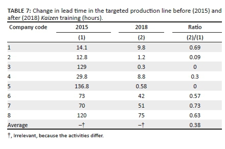 Finally, Table 7 provides strong evidence that the lead time declined tremendously after Kaizen was introduced, which led to improved delivery on time to customers. On average, the lead time in 2018 declined to only 38% of the 2015 level. This is highly consistent with labour productivity more than doubling as shown in Table 4. Particularly noteworthy is the decline in lead time to almost zero in the second, third, and fifth companies, versus the small decline in the seventh company. These findings support our hypothesis that the introduction of Kaizen had a significant impact on efficiency in management. This effect is exceedingly important regarding the satisfaction of customers, that is, OEMs (Original Equipment Manufacturers), because shortened lead time assures on-time delivery.