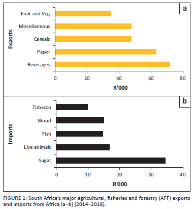 Figure 1 indicates South Africa's major agricultural exports and imports from Africa between the years (2014-2018). South Africa's top three agricultural export products to Africa were beverages, paper, and cereals each contributing an average of R7.2 million, R6.4 million, and R4.8 million to the total agricultural export revenue of South Africa, respectively. The diagram also reflects the top three agricultural imports from Africa destined to South Africa which include sugar, live animals, and fish with a value of R3.4 million, R1.7 million, and R1.5 million, respectively.