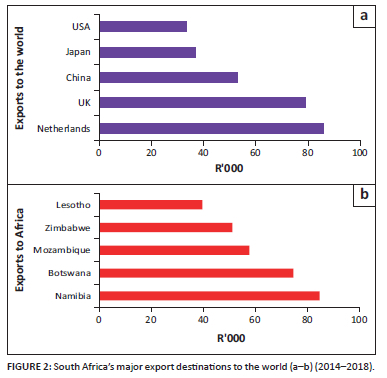 Figure 2 depicts South Africa's major export destinations to the world between (2014-2018). South Africa's top three export destinations, outside Africa, for agricultural products are the Netherlands, United Kingdom, and China contributing a total of R7.2 million, R6.4 million, and R4.8 million, respectively. Furthermore, South Africa's key export destinations in Africa include Namibia, Botswana, and Mozambique. The results suggest that South Africa's major export destination for agriculture is the Netherlands which accounts for almost 60% of South Africa's agricultural exports. This means South Africa trades more with third parties outside the region than its neighbouring countries in Africa do. The results also suggest that South Africa's major export destinations are concentrated in the Southern African region. This trend could motivate the need for South Africa to diversify its export basket to other parts of the African continent.