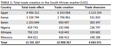 Table 2 shows the top six leading countries that stand to gain from the South African market in terms of total trade effect. Egypt is set to enjoy the highest total trade effect, recording a US$9 million increase in total trade. Two other noticeable AU member states that stand to gain on the South African market are Kenya and Benin, recording a US$3 million and US$1 million increase in total trade, respectively.