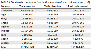RESULTS: The simulation revealed that South Africa will gain a total trade value of approximately US$199 million, and the total trade diversion from third parties will stand at US$42 million. South African agricultural commodities with the greatest export potential to the African market include sugar cane, maize, citrus fruit, cigarettes and sauces. Industries that are vulnerable to the free trade area include dairy, poultry, and vegetables. The full tariff liberalisation is projected to decrease South African's export revenue