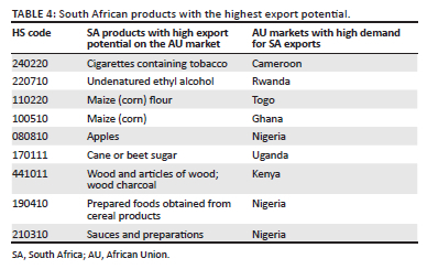The SMART simulation revealed South African products that have the highest trade potential on the AU market after full liberalisation. Table 4 shows that South African exports of cigarettes, maize (corn), maize flour, apples, wood, cereal and cane sugar stand to gain more from the FTA. The smart model also identified AU markets that South Africa will need to exploit in relation to the products highlighted. Cameroon conveys the strongest demand for South African cigarettes, followed by Togo and Ghana showing the strongest demand for South African maize exports. Nigeria, Kenya, and Uganda showed the strongest demand for cereal, wood, and sugar cane, respectively.