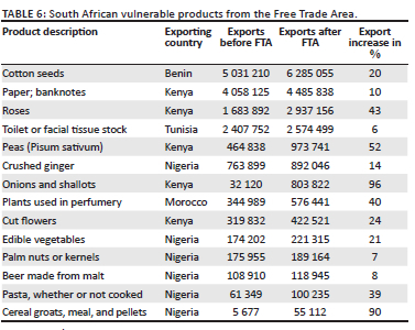 It is evident from Table 6 that the domestic production of cereal groats, onions, peas and roses are vulnerable to imports from the AU market. The SMART model shows a 96% increase in onion exports from Kenya to South Africa and a 90% export increase in cereal groats from Nigeria. The import increase in all the products above, will mostly benefit consumers from the reduction in commodity prices. South African consumers, especially those of cereal, roses, malt beer and peas will enjoy the benefit of reduced prices and greater quantities. On the other hand, domestic producers will be left out of business if they are unable to compete.