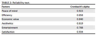 Based on the results observed, factors such as entertainment and economic value indicated full divergent validity, while Efficiency and Peace of Mind indicated partial divergent validity, as the square root of AVE was greater than two of the remaining four factors. Given that the factors identified during the EFA had sufficient reliability and the factors indicated divergent validity to some extent, the factors were deemed adequate for further analysis.