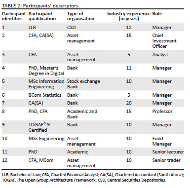 LinkedIn is a platform that connects professionals in various fields; it provided the researcher with the ability to target appropriate participants. This method of finding participants is also referred to as targeted sampling using social media. This approach is appropriate in research fields where participants would, in ordinary circumstances, be hard to reach (Dusek, Yurova & Ruppel 2015). The researchers viewed this approach as appropriate for the study as individuals in the securities value chain are generally hard to reach. Purposive sampling is used when the research involves a difficult-to-reach population. Once a portion of the population is reached, the researchers may use initial participants as a spring board to reach more members of the population. This referral process is known as snowballing (Creswell & Plano Clark 2011). A list of the participants for this study, as well as the organisation in which they work, is to be found in Table 2.