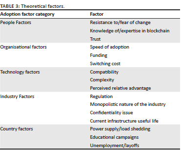 Existing models are limited in that they do not address the scope of this study which is the adoption of blockchain technology in the clearing and settlement industry in South Africa. The Technology Acceptance Model is limited because it focuses on explaining adoption at the individual (end-user) level, while the TOE framework is targeted at the organisation level. Although DOI theory encompasses both TOE and the TAM factors, it is limited, because it does not emphasise external factors (Oliveira & Martins 2011). Blockchain Adoption Model addresses, to some extent, the external factors, which are categorised as ecosystem factors, but fails to consider industry and country-specific issues Lustenberger et al. (2021).