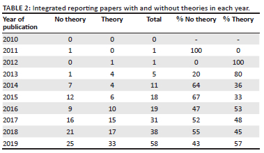 It is worth noting that of the 90 IR papers mentioning a theory, 36 papers utilise more than one theoretical perspective, resulting in the total reflected in Table 3 being higher than the total of the sample. This finding aligns with earlier studies, suggesting that a multi-theoretical perspective is often the most useful for explaining and understanding organisational practices, such as reporting (Fernando & Lawrence 2014).