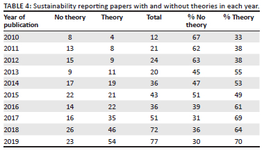 The following discussion relates to the sample of 392 articles about SR. Further analysis revealed that, of the total sample, only 229 papers utilise a theory to explain SR. Table 4 shows the SR articles over the last 10 years, broken down into articles that mentioned theories and those which did not.