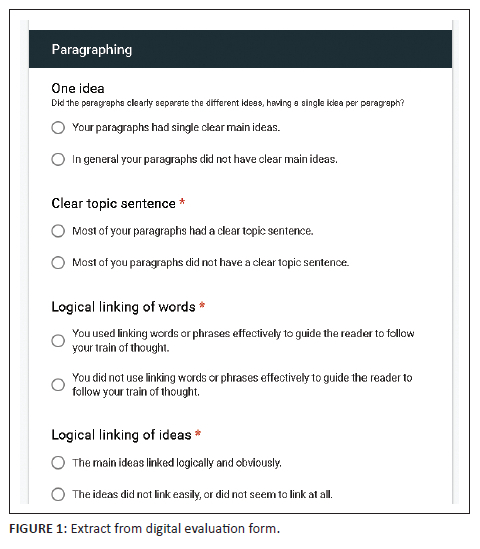 A mixed method exploratory sequential design (qualitative followed by quantitative) was used to investigate the observed trend in-depth and to measure its occurrence (Creswell & Clark 2017; Creswell et al. 2003). A similar approach was employed by Joubert and Feldman (2017). A rubric, a qualitative grading method in the form of an evaluation form, was utilised to record the evaluators' perceptions of the written assignments. The responses were then quantified for an in-depth analysis.