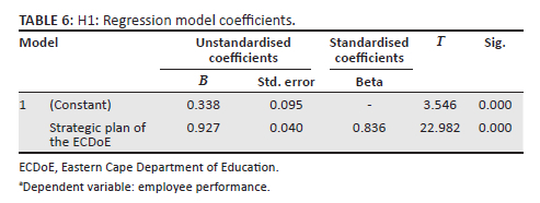 These results are consistent with a study conducted by Ajao, Oyeyemi and Olayinka (2016) on employee performance and the strategic plan. The results revealed that effective strategic planning indeed has a positive impact on performance. Although formal planning alone may not bring about better performance, effective implementation will suffice. This means that employee performance acts as a catalyst in achieving the goals in the Department's Strategic Plan. In addition, strategic planning plays a crucial role in monitoring the strategies to be used by an organisation or employees to achieve the set objectives and reviewing the outcomes with the expected results of an organisational strategic plan (Jacobsen & Johnsen 2020:16). By doing this, the employees would be able to achieve the goals, mission and vision of the Department. The results confirm that H0, stating that there is no relationship between employee performance and strategic plan alignment in the ECDoE, was rejected, while H1 was confirmed.