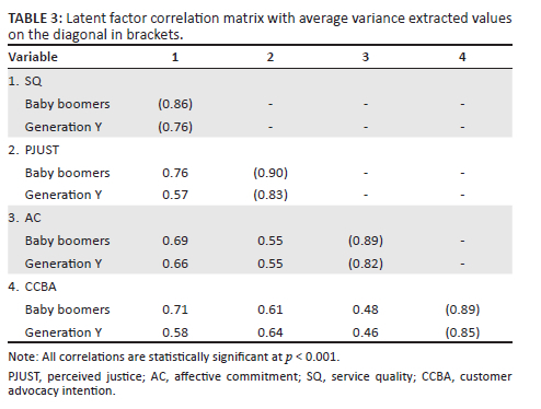The multi-group measurement model, based on the cohorts, also presented acceptable fit statistics: χ2 = 419.83; df = 190; χ2/df = 2.21; CFI = 0.97; TLI = 0.97; RMSEA = 0.073. The χ2 contribution was 171.17 for the baby boomer cohort and 248.66 for the Generation Y cohort. All standardised factor loadings were more than 0.7, statistically significant (p < 0.001), and ranged between 0.90 and 0.98 for the baby boomer cohort, as well as between 0.82 and 0.96 for the Generation Y cohort. Regarding both cohorts, all AVE values exceeded 0.5 and all CR values were larger than 0.7, thereby evidencing convergent validity and reliability (Hair et al. 2014). In all instances, the AVE values of the respective latent variables exceeded the shared variance among them, subsequently evidencing discriminant validity (Fornell & Larcker 1981; Hair et al. 2014).