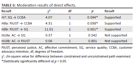 The results were analysed using Mplus version 8.4. Confirmatory factor analysis (CFA) and multi-group structural equation modelling (SEM) using maximum likelihood estimation with robust standard errors and a mean- and variance-adjusted test statistic were applied to test the research hypotheses. The χ2 difference test, bootstrapping (95% confidence interval and 5000 replications), and the Wald test were employed to assess the extent to which generational cohorts moderate the direct and indirect effects between perceived justice and customer advocacy intention through service quality (Wang & Wang 2012:278).