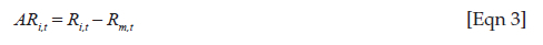 Where ARi,t is the abnormal return of security i at time t, Ri,t is the return on security i at time t, Rm,t is the return on the market index at time t. Thus, the average abnormal return is estimated as follows: