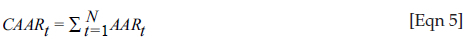 Where AARt is the average abnormal return for the number of bond and equity issues at time t, N is the total number of bond or equity issue announcement used in the sample. The AARs are summed up through the entire event window to form a CAARs as follows: