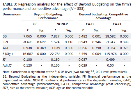 As per the regression analysis provided, the relationships among the variables, namely Beyond Budgeting, competitive advantage and performance, remain statistically unaffected by the inclusion of the control variables SIZE and AGE. These findings suggest that, within the scope of the available data, the size and age of an organisation exert minimal to negligible influence on the associations between these variables. Table 6 illustrates the main finding of the study.