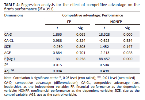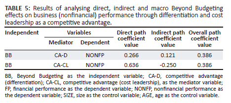 The regression equation model for H31 is not stable, as shown by the insignificant value of F = 1.331 in Table 4. This means that the firm's FP cannot be estimated by the CA (CA-D, CA-CL) and the control variables (size and age). The CA also has no significant effect on the FP, as shown by the insignificant value of T at 4% significance level and the low value of Adj.R2 (0.3%). Therefore, the FP is excluded from the indirect impact tests because the CA is not a valid mediator. However, the regression equation model for H32 is stable, as shown by the significant value of F = 88.457 at 5% significance level. This means that the firm's NONFP can be estimated by the CA (CA-D, CA-CL) and the control variables (size and age). The CA (CA-D) has a significant and positive effect on the NONFP, as shown by (ß = 0.703, t = significant). The value of Adj.R2 (49.8%) indicates that the CA (CA-D) explains almost half of the variation in the NONFP. Nonfinancial measures are more actionable and future-oriented, and their use can improve an organisation's capabilities in future planning and strategy implementation (Spencer, Joiner & Salmon 2009). The results are in line with the common belief that differentiates put a premium on nonfinancial variables (Hoque 2004; Porter 1980), but they also show that this is not always the case. Based on this, the third main hypothesis is accepted.