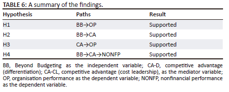 The direct path coefficient between BB and NONFP is 0.266, indicating a positive relationship through CA-D, whereas the indirect path coefficient measures the influence of CA-D as a mediator variable between BB and NONFP, resulting in a coefficient of 0.121, affirming subhypothesis H41. However, the overall path coefficient demonstrates that BB significantly and positively affects NONFP through CA-D, with a coefficient of 0.386. These are consistent with the researchers' argument that strategy that is tailored to a firm's internal and external environment is very likely to provide greater performance, according to the theory underlying the body of research on the relationship between strategy and performance (Parnell, Acikdilli & Doyle 2019; Salisu & Goni 2019). Nonfinancial performance measures, including customer loyalty, market share and brand equity all benefit from these developments. Moreover, Alsheikh (2020) and Tavitiyaman, Qu and Zhang (2011) both agree that the relationship between organisational performance and competitive strategy is complex and far from settled.