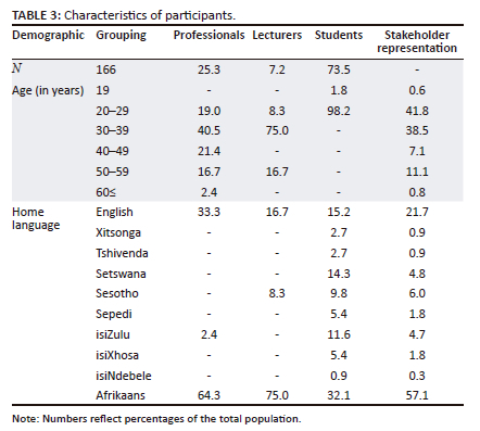 Thirty-seven businesses agreed to participate, and a total of 52 professionals participated. One participant was excluded because of nationality and nine participants did not fully complete the survey. Finally, 42 professionals' surveys were usable: 13 practitioners, seven managers, 16 practitioners and managers and 6 in other roles, such as director or graduate recruiter and supervisor of The South African Institute of Professional Accountants (SAIPA) trainees' internship programme. The demographic variables related to age and home language per stakeholder group are presented in Table 3.