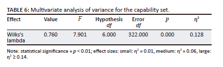 Multivariate analysis of variance (MANOVA) was used to determine whether value, enablement or achievement led to a capability set. Using effect sizes for partial eta squared was appropriate to gain insight into how small or large the difference between stakeholder groups was. The small effect is η2 = 0.01, the medium effect is η2 = 0.06 and the large effect is η2 0.14. Finally, descriptive statistics were used to analyse the demographic variables.