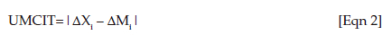 As Cattaneo and Fryer (2002) point out, it is important to incorporate a qualification when selecting a suitable index for examining adjustment costs concerning intra-industry trade. Menon and Dixon (1997:164) contend that the focal point should be measuring new inter-industry or unmatched trade, typically treated merely as a residual component. They propose utilising unmatched changes in trade (UMCIT) measures, asserting its greater suitability for research focussed on adjustment costs. Unlike MIIT, UMCIT can quantify the extent of trade changes necessitating inter-industry factor adjustments and is measured as follows (Equation 2):