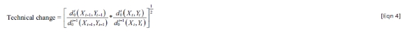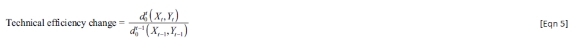 Equation 4 means that if the productivity evaluated in the current period's production technology differs from the previous period's production technology, it indicates technical change - an inward or outward shift in the production function. If it exceeds one, it suggests technological progress. An index of unity indicates that the DMU remains on the frontier, indicating best practice or benchmarking (see Equation 5):