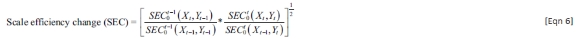 In the Malquist approach to analysing total factor productivity change, Equation 6 shows that scale efficiency change is determined by taking the geometric mean of two components: scale efficiency change concerning the previous period's production technology and output, and scale efficiency change concerning the current period's production technology and output (see Equation 7):